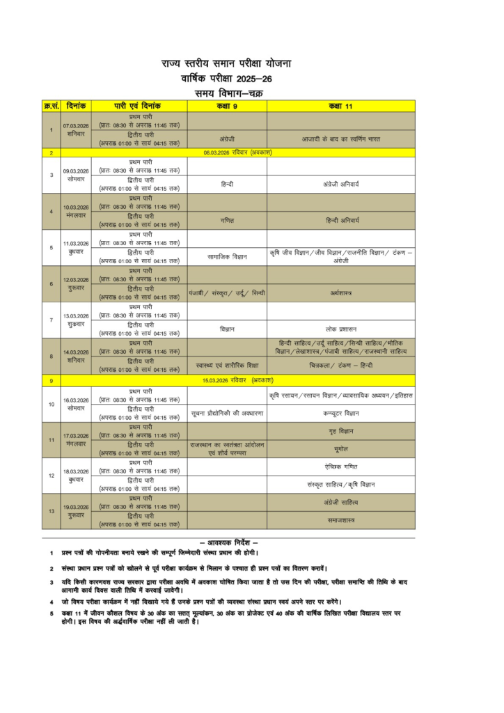 RBSE 9th Time Table 2026 RBSE 11th Time Table 2026 राजस्थान हो सकता है राजस्थान में कक्षा नौवीं की जो वार्षिक परीक्षाएं होने वाली है उसका टाइम टेबल जारी कर दिया है अब आरबीएसई द्वारा राजस्थान की सरकारी और संबंध निजी विद्यालयों में पढ़ने वाले विद्यार्थियों के लिए आयोजित की जाने वाली वार्षिक परीक्षा का समय सारणी को जारी कर दिया है इस बार कक्षा 9 की वार्षिक परीक्षाएं 7 मार्च से 17 मार्च 2026 तक आयोजित किए जाएंगे चलिए मैं आपको कक्षा 9वी और 11वीं का समय सारणी नीचे टेबल के माध्यम से आसान शब्दों में समझता हूं.